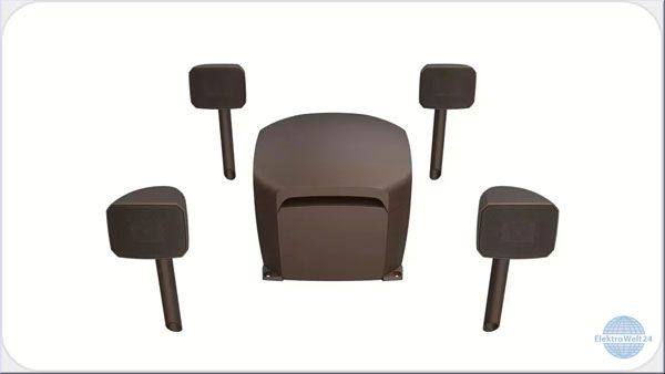 Im Lieferumfang steckt alles, was für einen schnellen Start nötig ist: vier ausrichtbare Satellitenlautsprecher mit hornunterstützter Abstrahlung, ein passender Subwoofer sowie Montagematerial inklusive Pfosten und Erdspießen. Damit lässt sich das System sauber platzieren und optimal auf Sitzbereiche, Wege oder Terrassenkanten ausrichten.