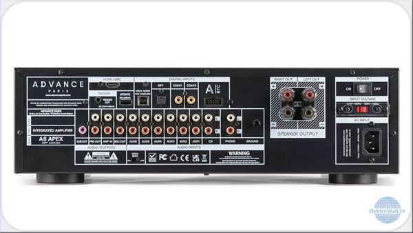 Der A8 APEX ist ein hybrider integrierter Verstärker, inspiriert von A10 und A12, der ECC81/12AT7-Röhren und Transistoren kombiniert und eine Leistung von 2x75W in Klasse A/B bietet. Er bietet Eingänge für verschiedene Quellen (analog, digital, USB, HDMI e-ARC) und erweiterte Funktionen (1 Subwoofer-Ausgang, Pre-Out, Amp-In).